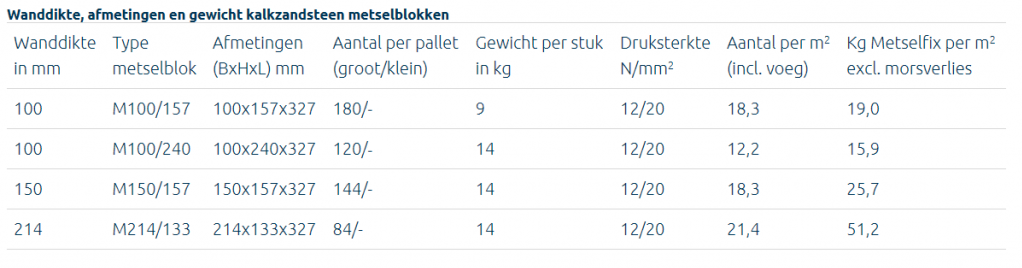 Mortelverbruik is bepaald bij een lintvoeg van 10 mm, blokken koud tegen elkaar met gevulde mortelkamers.