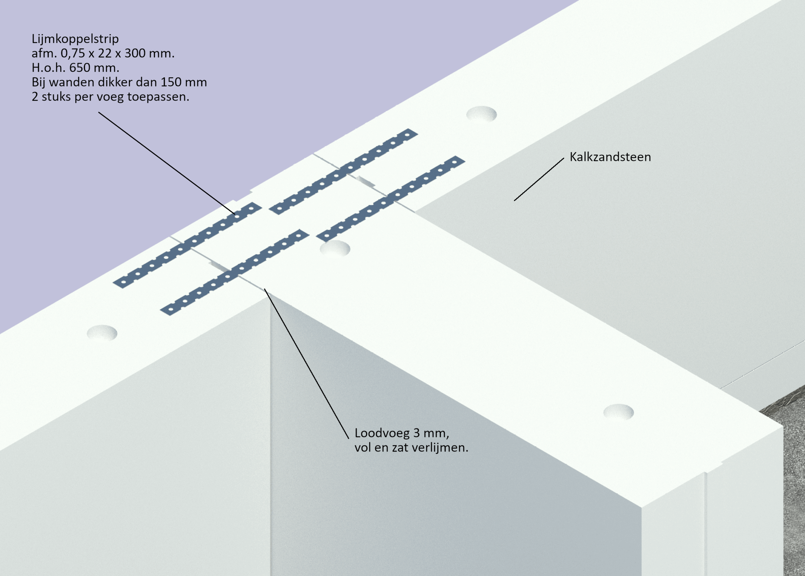 Een constructieve verbinding van twee wanden zoals een penant met een bouwmuur voert u bij voorkeur uit als gelijmde voeg (loodvoeg). Uit onderzoek van TNO Bouw blijkt dat dit verwerkingstechnisch de beste optie is. Een samenvatting van het onderzoek kunt u opvragen bij onze afdeling Techniek & Advies.