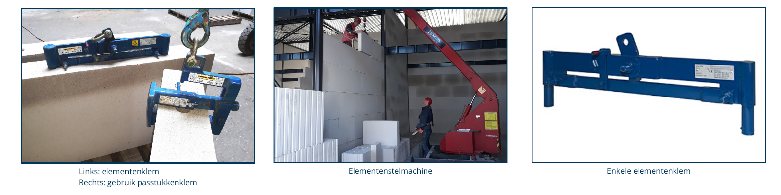 Voor een goede verwerking is hijsmaterieel op de markt verkrijgbaar, zoals opperklemmen en diverse elementenstelmachines met bijbehorende klemmen.