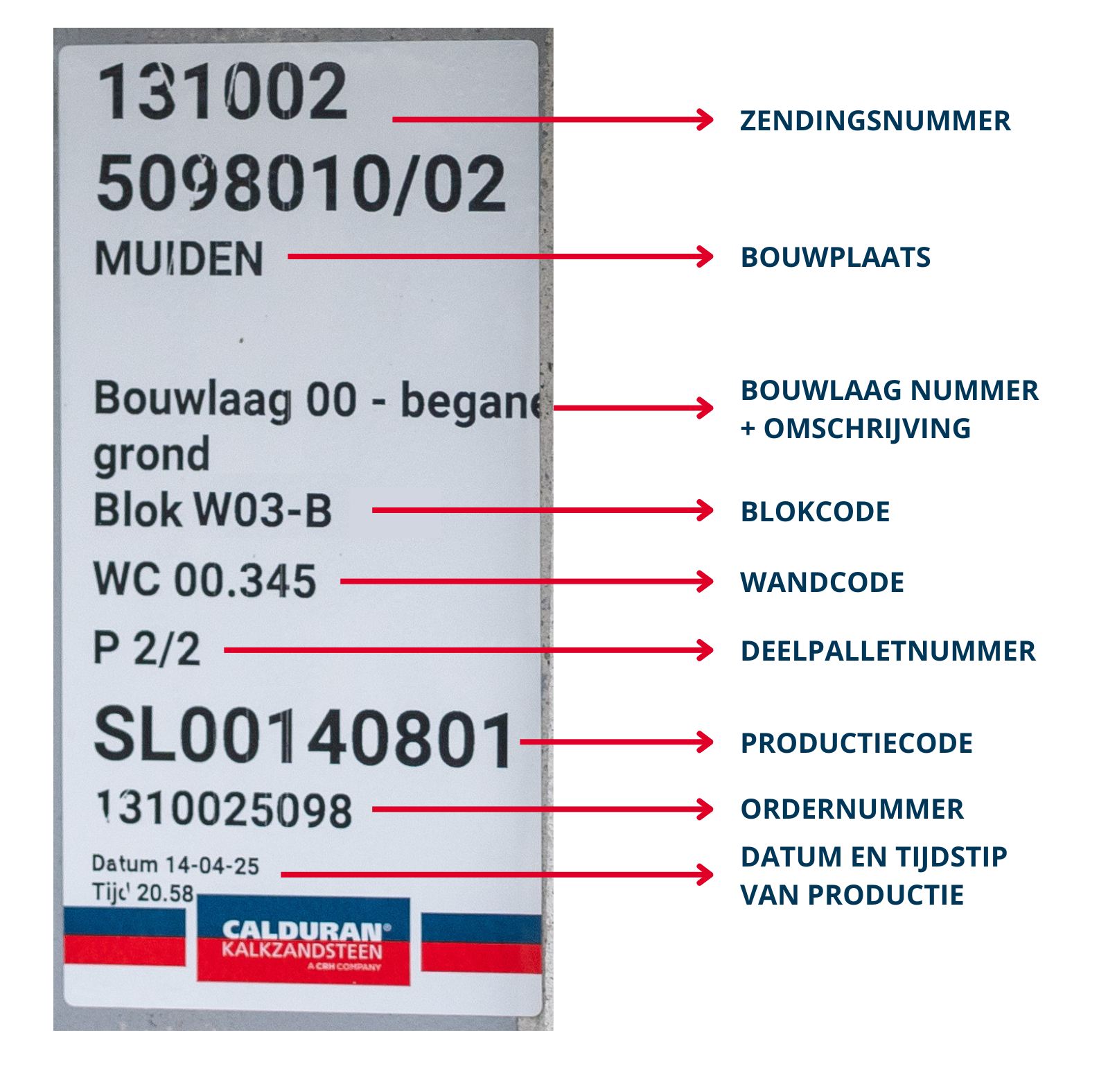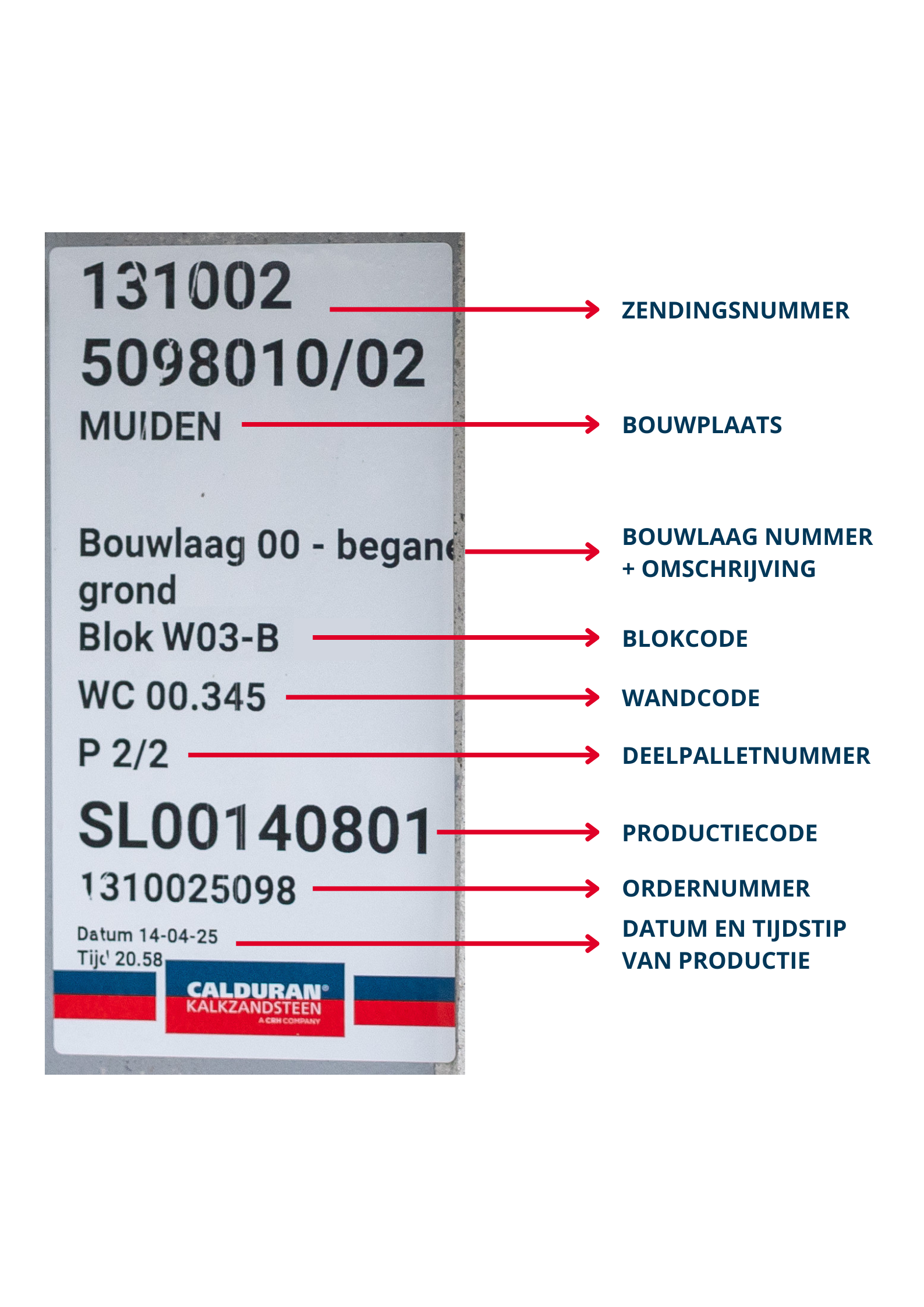 De palletstickers zijn voorzien van het herkenbare Calduran-logo en tonen alle relevante informatie in één oogopslag. Dit maakt onze pakketten direct herkenbaar en zorgt voor een efficiëntere verwerking op de bouwplaats.
