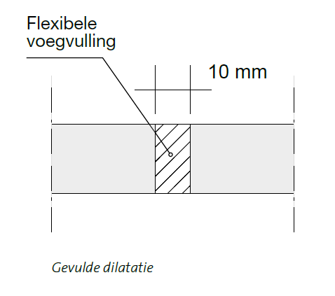 Een gevulde dilatatie wordt toegepast in wanden op een doorbuigende ondergrond zoals een begane grondvloer, verdiepingsvloer, een flexibele aansluiting en/of akoestische ontkoppeling. Deze vloeren buigen in de praktijk wel 5-10 mm door. Door de grotere voegbreedte kan deze vervorming beter worden opgenomen worden. De gevulde dilatatie heeft een breedte van 10 mm.
